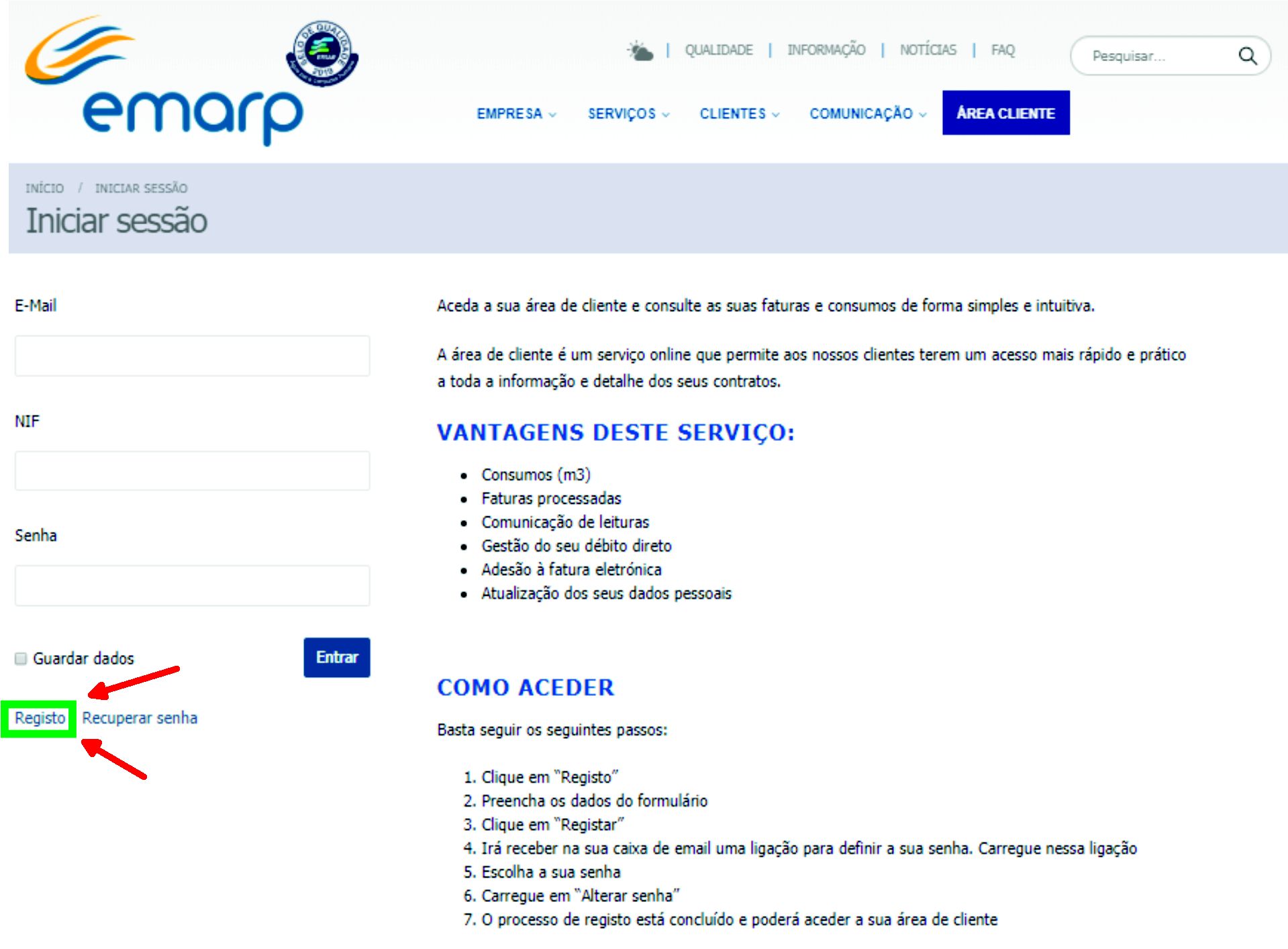 Basta ir ao nosso site em www.emarp.pt, clicar sobre “ÁREA CLIENTE” e seguir as seguintes indicações: